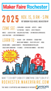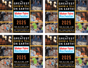 Maker Faire Rochester is on Saturday, November 18th from 9 AM to 5 PM at the Rochester Riverside Convention Center. Get your tickets at rochester.makerfaire.com.